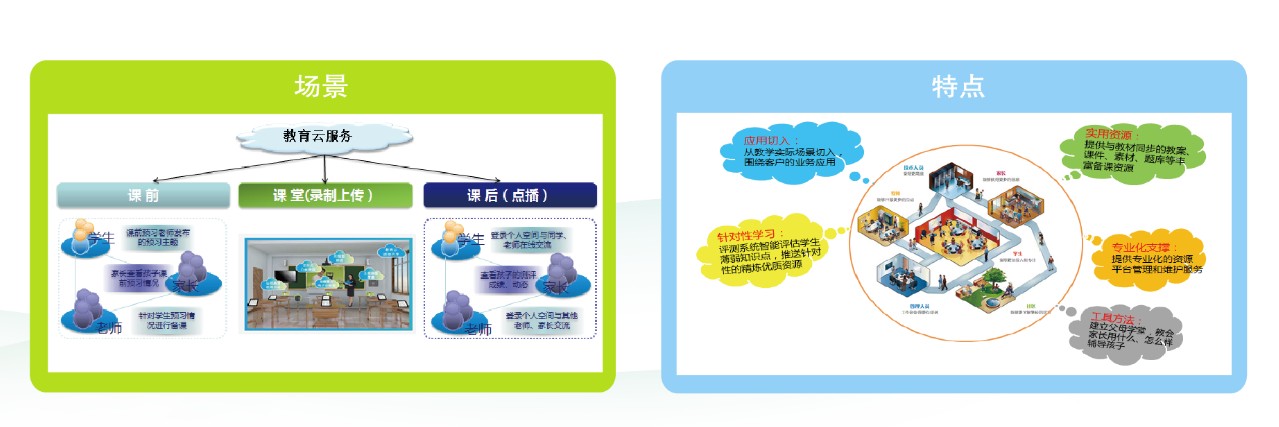教育云实现了智慧校园和智慧家庭的无缝连接,学生在家里可随时登录个人空间复习课堂所学的课件和教辅资源;教育云打造处处可学习的教学环境,老师在家里可随时上传备课课件到自己的个人空间并在课堂上随时取用;教育云为教育主管部门和学校实现了全面的资源共享,通过教育云,教育主管部门实现了建设区域数字教学资源共享平台,加强优质教育资源开发与应用的初衷,学校得以完善精品课程建设,建立丰富、开放、便捷的校本教学资源体系。