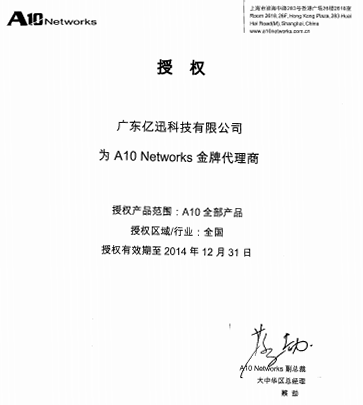通过美国A10 Networks公司的相关技术培训、考试以及对亿迅的实地考察,亿迅公司获得了其颁发的金牌代理商授权资质。该资质授权产品范围为A10全系列产品,不限区域与行业。
