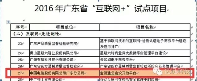 亿迅科技“金视通云会议开放平台”在中国电信广东公司的大力支持下成功入围由广东省经济和信息化委主办的2016年广东省“互联网+”试点项目。