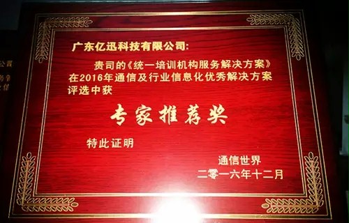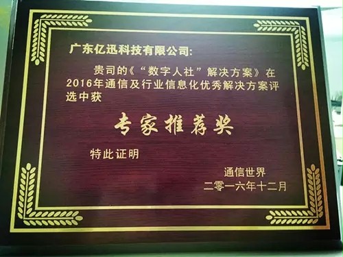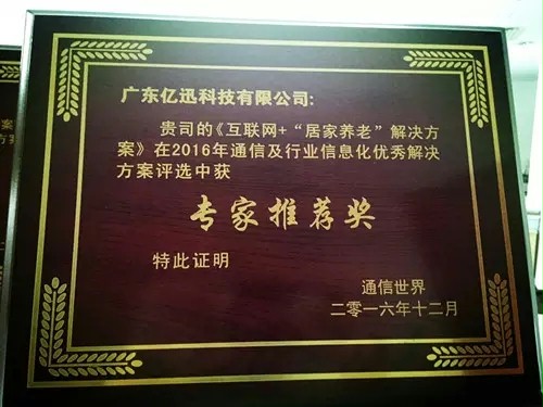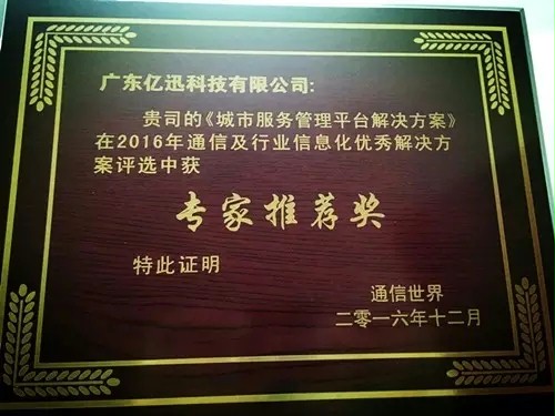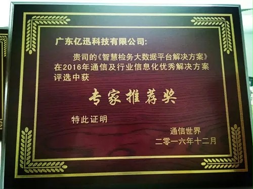 2016年末,亿迅科技再次凭借“城市服务管理平台解决方案” 、“互联网+居家养老解决方案”、“数字人社解决方案”、“统一培训机构服务解决方案”和“智慧检务大数据平台解决方案”荣获2016年通信及行业信息化优秀解决方案。