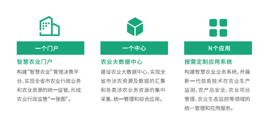 智慧农业云平台通过新一代的物联网、大数据、3S等信息化技术整合省市县各级涉农资源,以顶层设计方式建成“一个门户+一个中心+N个应用”,汇聚各农业领域、产业、业务数据,形成大数据中心,构建“互联网+农业”信息服务体系,科学地指导农业生产经营、政府决策监管和社会公众服务。