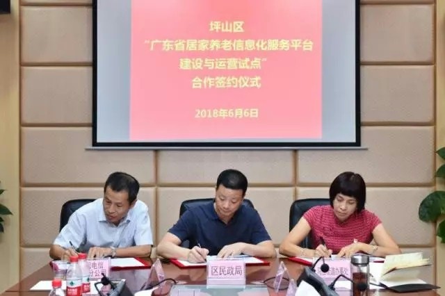 近日,深圳市坪山区成功举行“广东省居家养老服务信息化平台试点”合作签约仪式,中国电信深圳分公司政企中心杜总,区民政局福利科黄主任、马峦街道办事处主任三方代表签署了合作协议,标志着坪山区“广东省居家养老服务信息化平台试点”工作有了新的突破,进入实质推进阶段,进一步推进智慧养老服务民生工程,落实广东省居家养老服务信息化平台建设。
